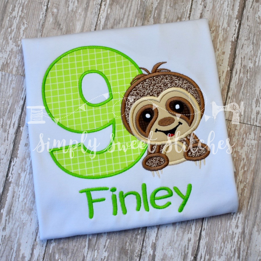 1163 - CUTE SLOTH BIRTHDAY NUMBER - APPLIQUE CHILD SHIRT