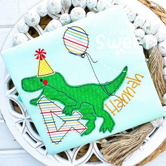 2447 - T-REX DINOSAUR BIRTHDAY NUMBER WITH BALLOON - APPLIQUE CHILD SHIRT