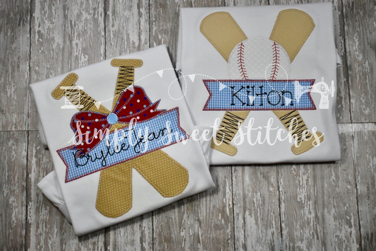 1371 - BASEBALL BATS WITH BOW - APPLIQUE CHILD SHIRT