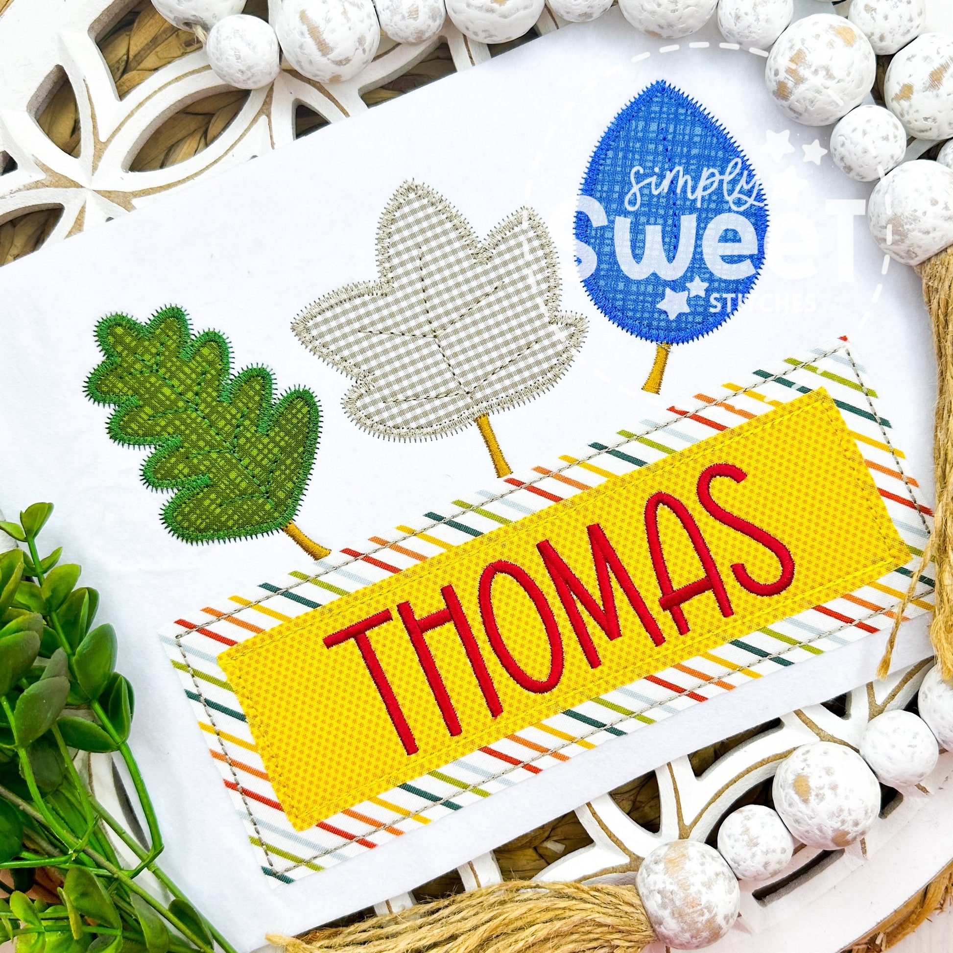 2944 - BOY FALLING LEAVES WITH NAME PLATE - APPLIQUE CHILD SHIRT